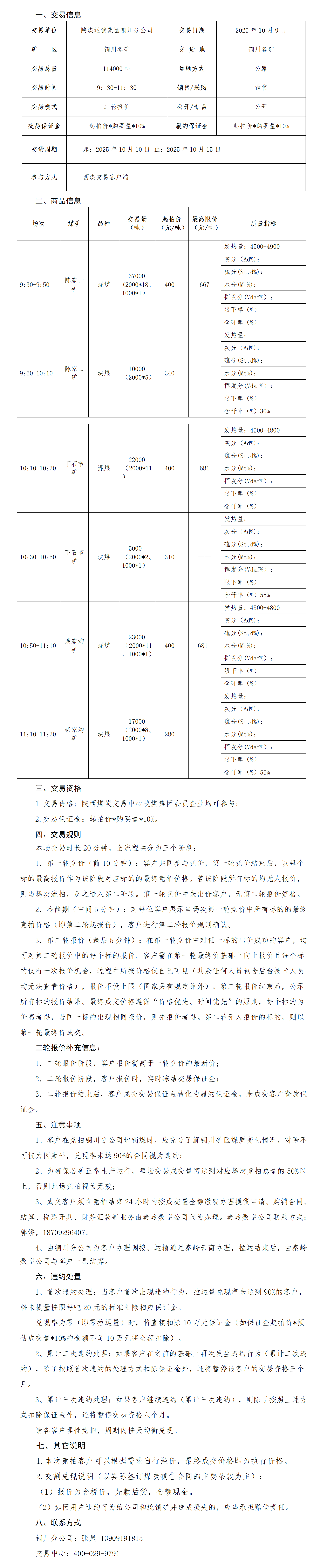 >10月9日陕煤运销集团铜川分公司交易公告